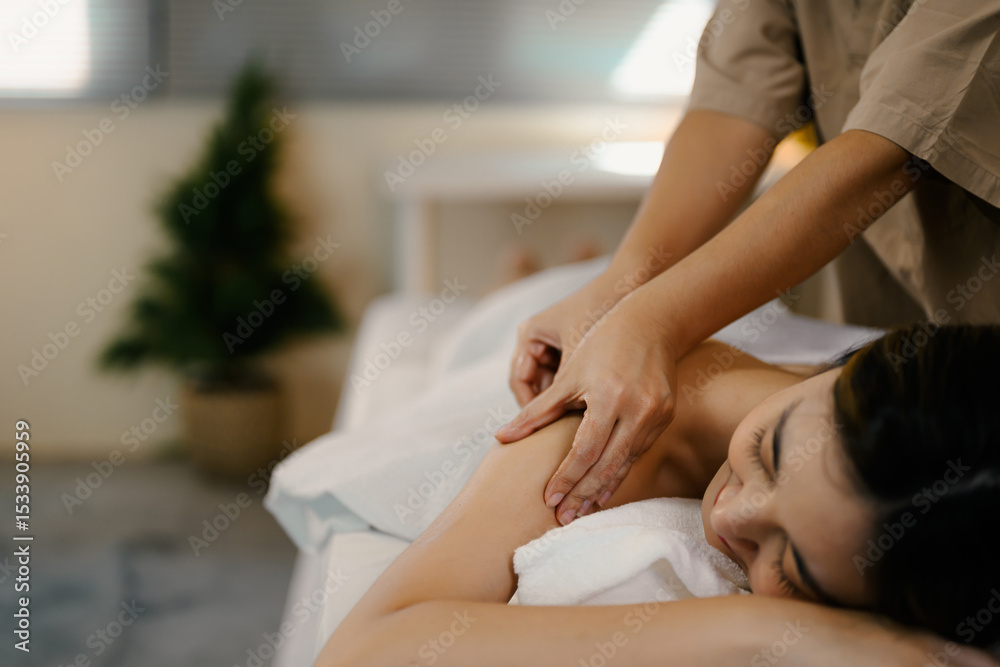 Closeup relaxed woman lying on massage table while massage therapist massages her