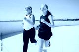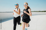 Two Energetic Young Women Enjoying a Sunny Jog on a Modern Outdoor Track While Wearing Stylish Sunglasses and Athletic Gear