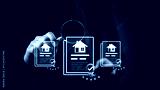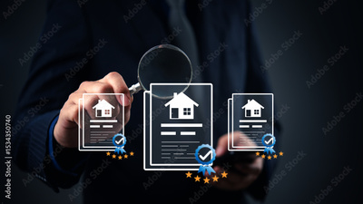 Man use magnifying glass real estate documents house icons and quality certification seals. guaranteed investment in property, homeownership and transparent transactions in the real estate market.