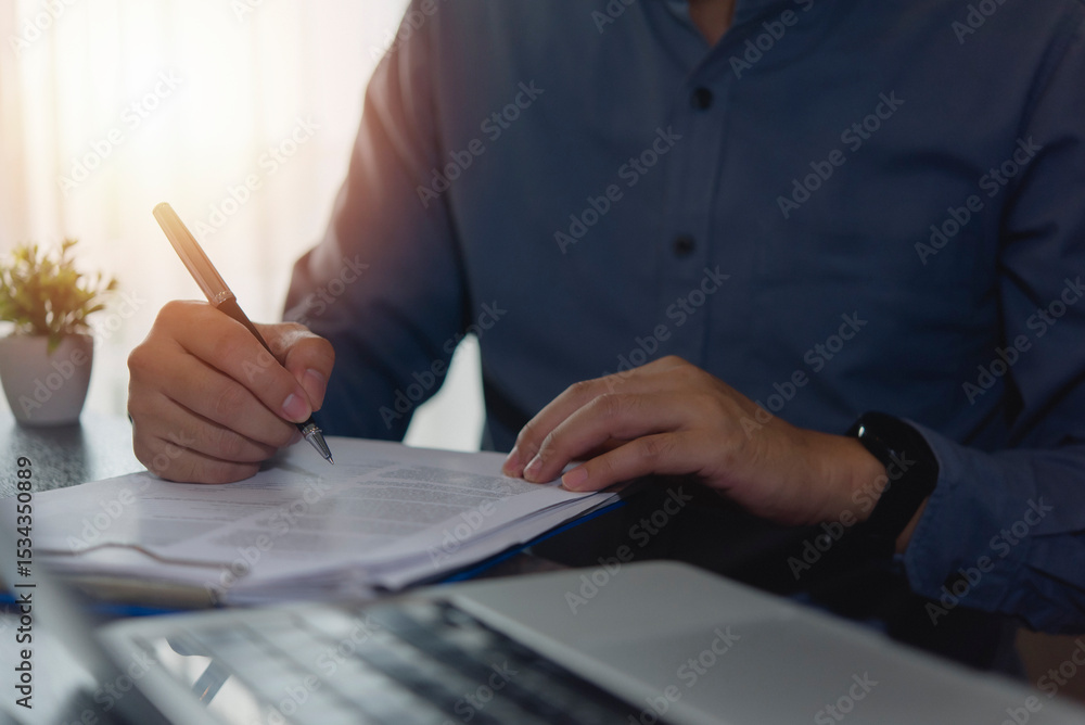 Businessman writing or signing a formal document at desk, contract or agreement, approval, and official paperwork. business legal processes concept.