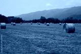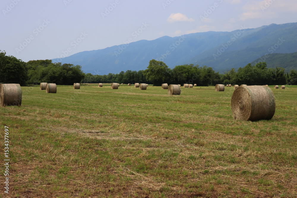 Many dry hay bales in the meadowagainst mountain background .Grass field harvested on summer in northern Italy