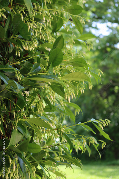 White climber star Jasmin hedge with many white flowers in the garden. Trachelospermum jasminoides in bloom