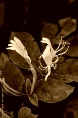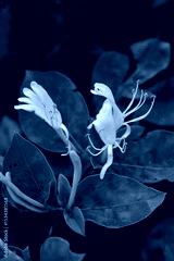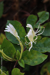 Close-up of white and yellow Honeysuckle flowers. Lonicera japonica, known as Japanese honeysuckle in bloom