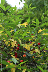 Sour cherry tree with disease in summer. Rotting cherries and yellow spotted leaves on Prunus cerasus