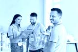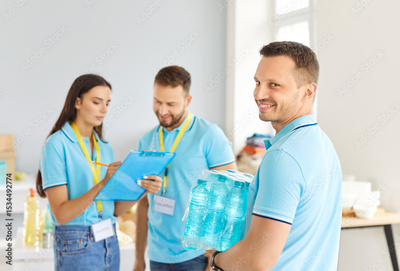 Smiling cheerful man carrying water bottles with his colleagues standing nearby with clipboard. Volunteers at humanitarian aid center preparing free food for donation to people in need. Food bank.