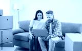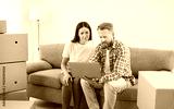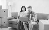 Happy young married couple man and woman sitting on sofa in living room in new apartments using laptop together with unpacking cardboard boxes. Moving day, relocation and rent concept.
