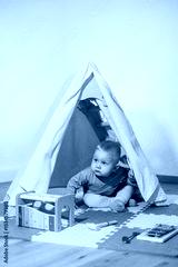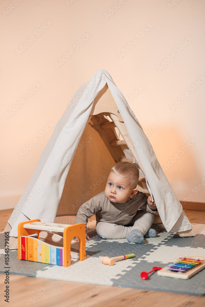 Cheerful 2 year old boy sitting near the wigwam and playing with a wooden toy. Toddler boy in a beige t-shirt sitting in the living room and playing with toys. Child in comfortable home clothes