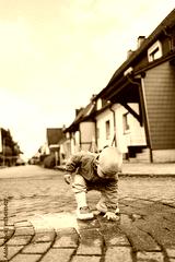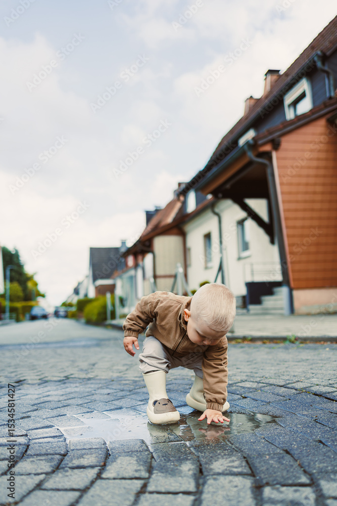 A 2-year-old boy in a light jacket and rubber boots runs through puddles after the rain. A boy in boots stands in a puddle. The child rejoices in the rain and runs along the wet street.