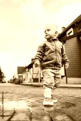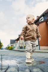 A 2-year-old boy in a light jacket and rubber boots runs through puddles after the rain. A boy in boots stands in a puddle. The child rejoices in the rain and runs along the wet street.