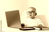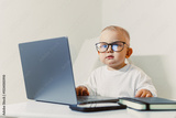 A 2-year-old boy dressed as a businessman in glasses sits at a table and works on a laptop. A toddler in a white T-shirt sits and watches a video on a laptop. A child works on a laptop.