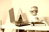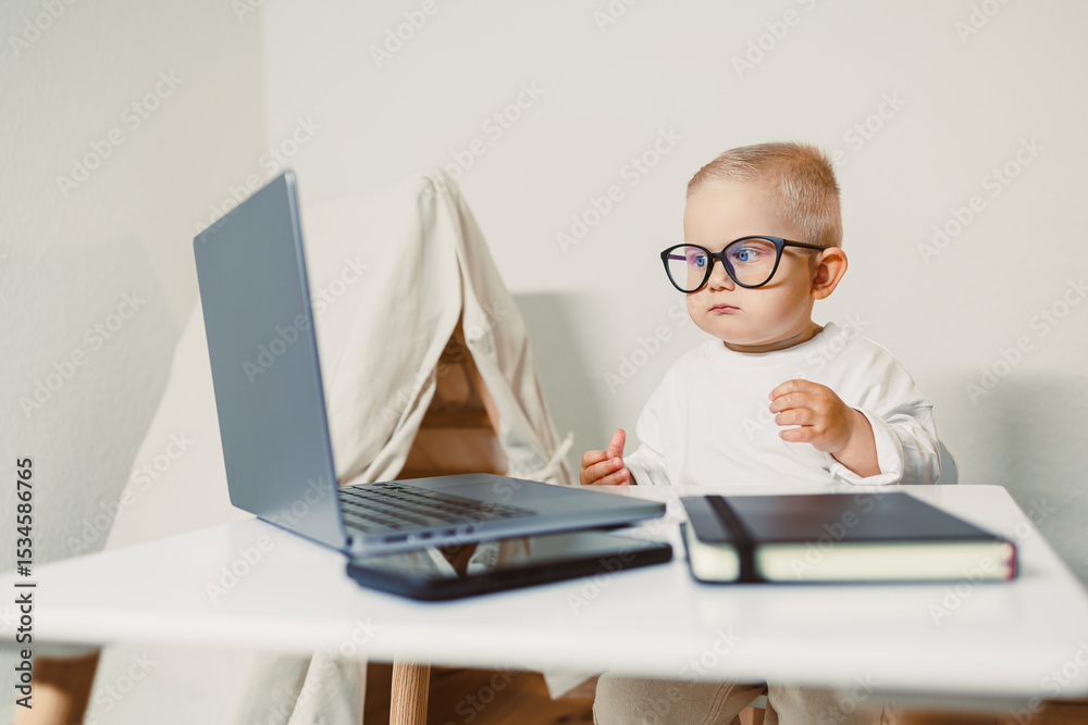 Stylish 2 year old boy child in office. Serious little children business man. Young toddler businessman. Little boss in office. Young businessman using laptop.