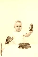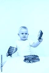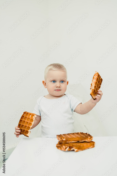 A curious little toddler is having a wonderful time enjoying delicious waffles at a bright white table, showcasing their joyful and playful nature as they explore this delightful meal
