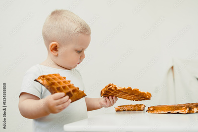 A Curious Toddler is Delightedly Exploring Various Waffle Treats in the Kitchen A Truly Delightful and Joyful Moment Captured for Everyone to Cherish and Enjoy Forever in Their Hearts