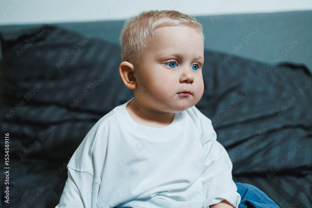 An absolutely adorable toddler is sitting comfortably on the bed, showcasing strikingly beautiful blue eyes. This delightful child exudes a sense of innocence and joy, making it a cherished moment