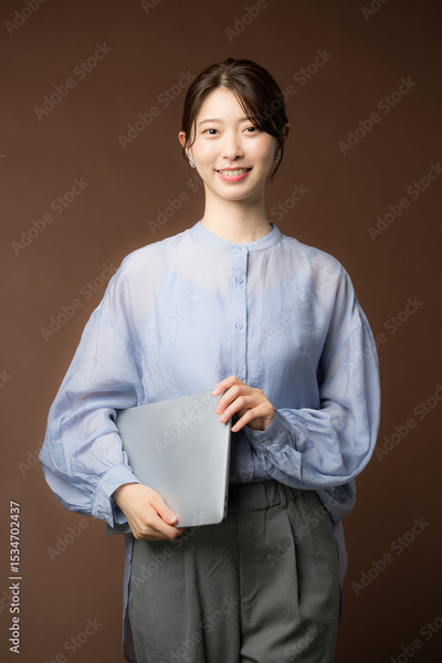 茶色い背景でノートパソコンを持つビジネスシーンの女性のカメラ目線