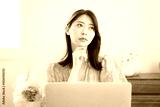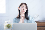 部屋でパソコンをみて考える悩む迷うかわいい女性 ちょっと真剣なネガティブイメージ 転職どうしようかな~