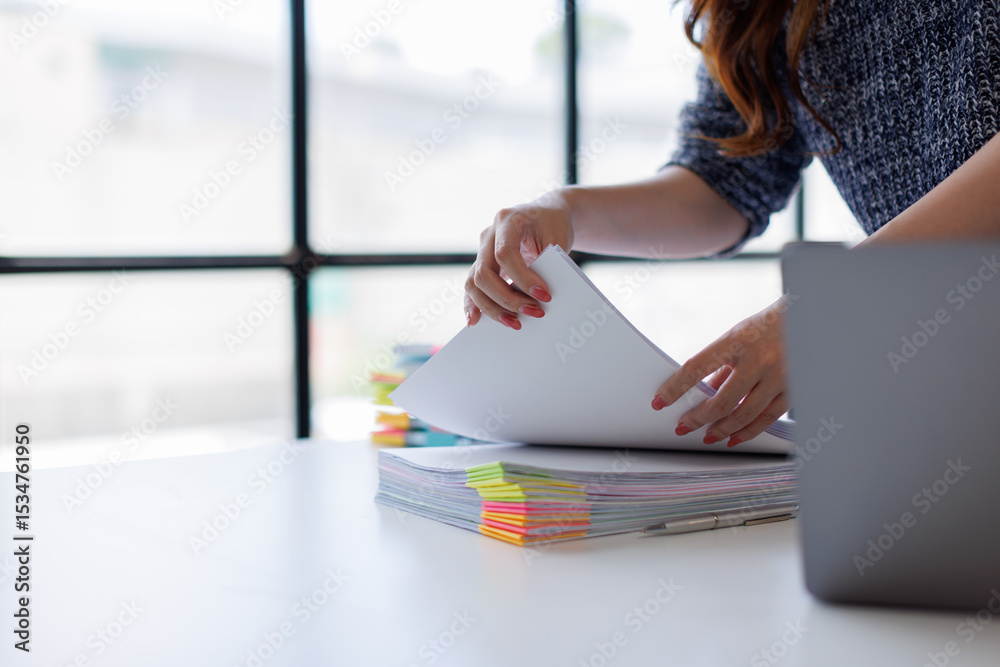 Close up of hands working in Stacks of paper files for searching and checking unfinished document achieves on folders papers on desk.