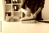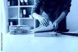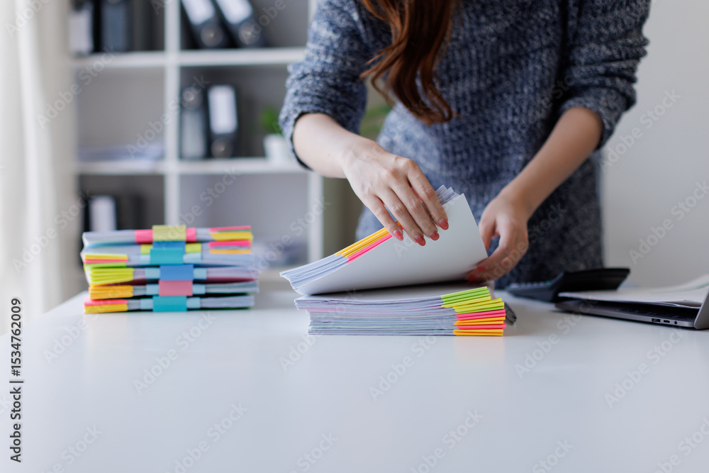Close up of hands working in Stacks of paper files for searching and checking unfinished document achieves on folders papers on desk.