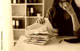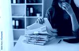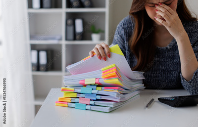 A stressed and sad serious young Asian business woman focuses on working on her business financial reports at her desk in the office.