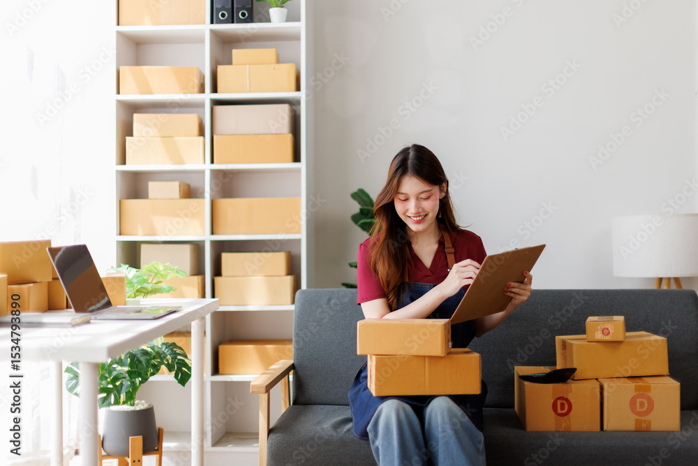 Small and Medium Enterprises (SMEs) are crucial for economic growth, Starting Small business asian woman entrepreneur SME freelance, woman check stock on clipboard and parcel at workplace office.