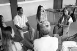 Students and professor discussing in support group at university classroom