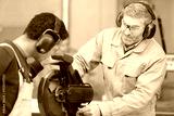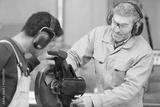 young man being shown circular saw in factory