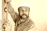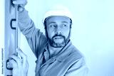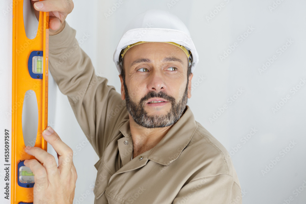 mature tradesman holding spirit level vertically
