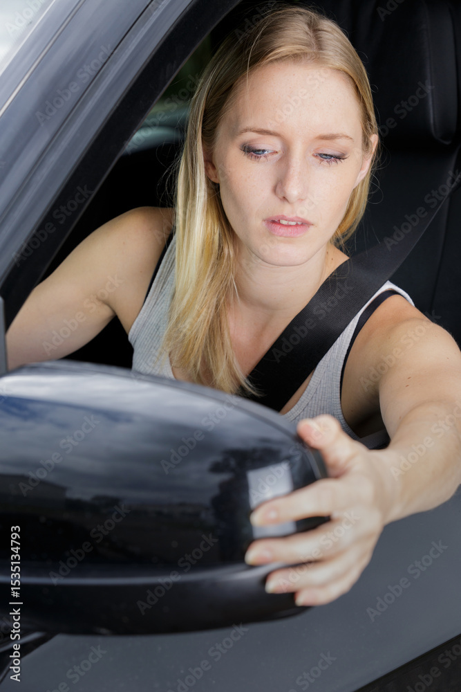 young female driver fixing side mirror