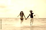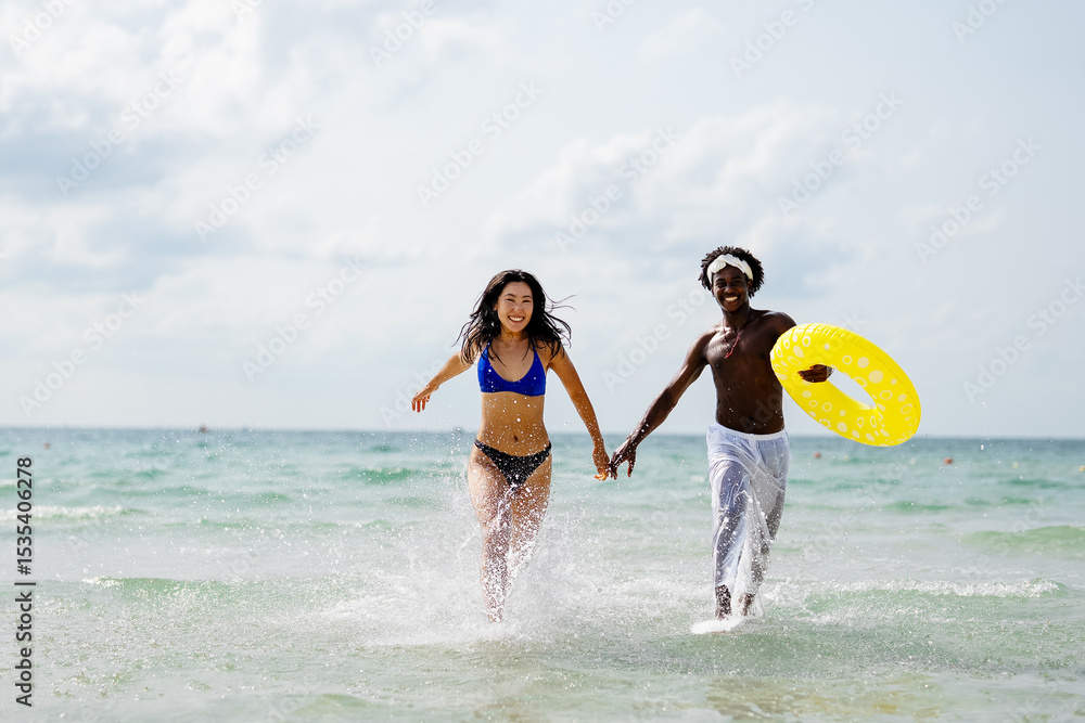 Carefree couple enjoying a tropical beach vacation, laughing making unforgettable memories together