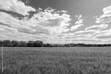 A large field with green spikelets. A field where rye and wheat ripen.