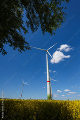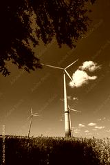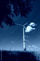 Large windmill turbines in a field with blue sky. Windmill field in the countryside in Europe.