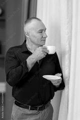 Portrait of handsome confident man in in suit holding cup of tea and coffee. Confident elegant mature businessman.