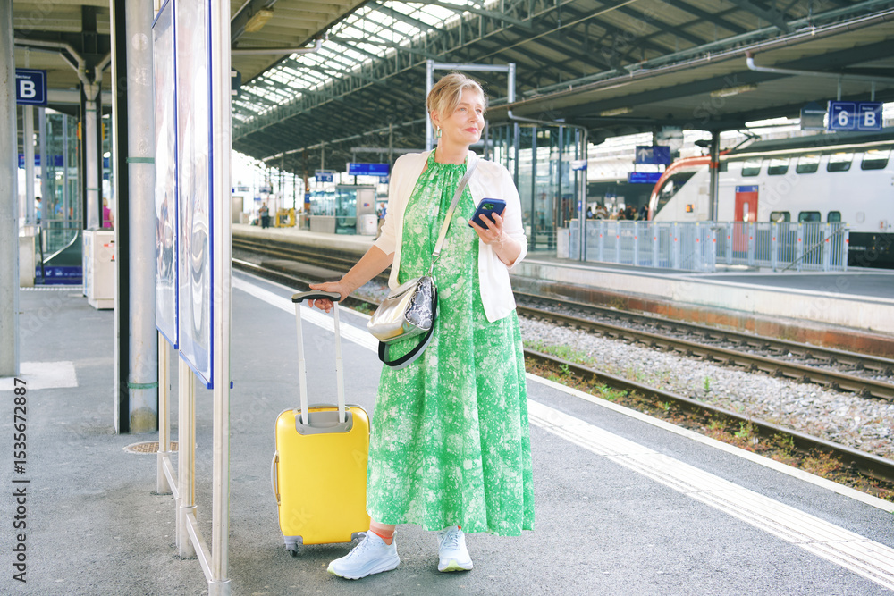 Outdoor portrait of 55 - 60 year old woman at the train station, vacation and active lifestyle