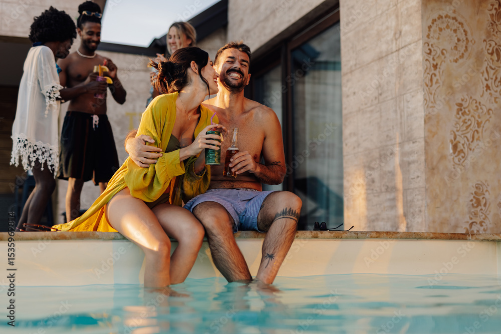 Young couple kissing and enjoying drinks at luxury pool party with friends