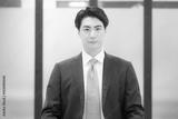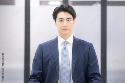転職の面談や面接、昇進の面談などのビジネスイメージ スーツを着た若い男性の真剣な表情全身