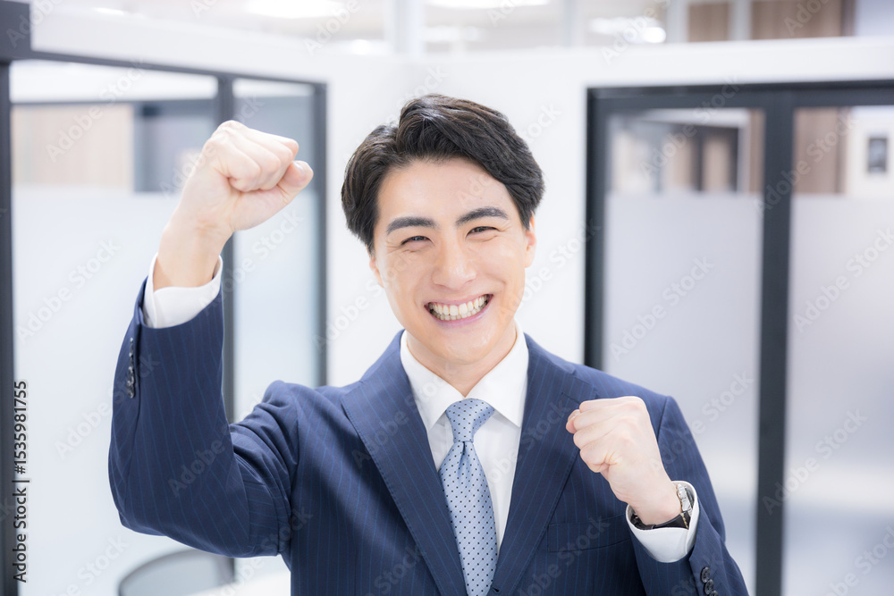綺麗なオフィスでビジネスマンのガッツポーズのカメラ目線 達成や成功、合格のイメージ