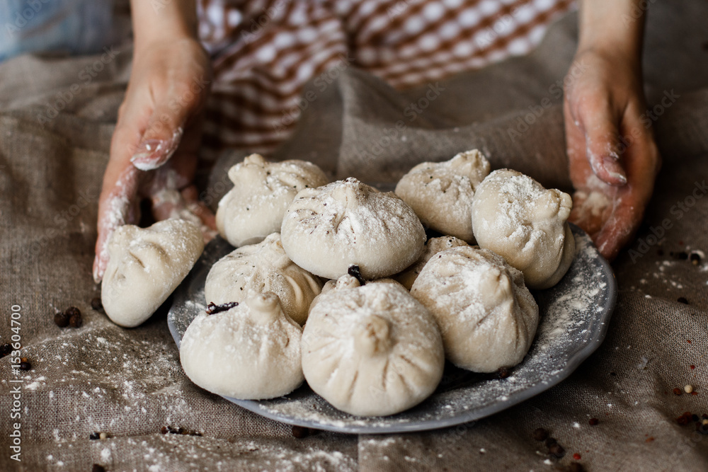 National Georgian cuisine Khinkali. Senior woman prepares khinkali. Top view raw meat dough dish uncooked. Process cooking.
