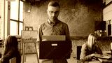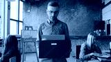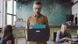 Handsome young man getting fired from work. Sad male walks through the office, carrying box with personal belongings.