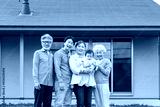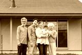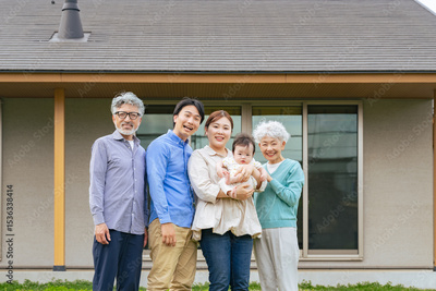 住宅の前で赤ちゃんを笑顔で囲む三世代家族の集合写真