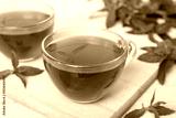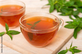 Cup of mint tea on table background. Green tea with fresh mint top view with copy space