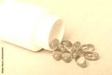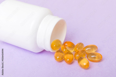 Omega-3 capsules lie in white bottle on a table background. Fish oil tablets top view. Biologically active additives. omega 6, omega 9, vitamin A, E, vitamin D, vitamin D3, evening primrose oil