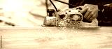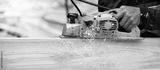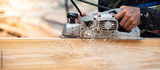 Male carpenter hand using an electric planer on wooden plank at construction site. Woodworker planing timber in his workshop with sawdust spreading around. Lumber industry and carpentry work tool