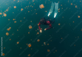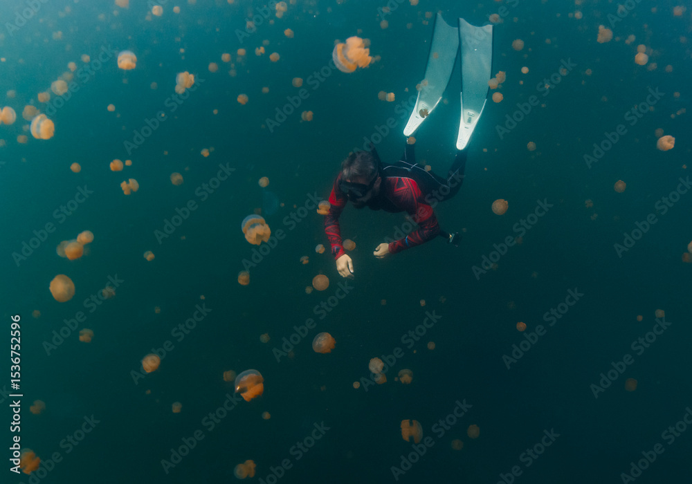Freediver swims underwater in the lake full of jellyfish. West Papua, Misool, Indonesia
