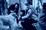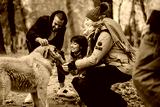 Group of friends bonding with a dog in a serene park, showcasing companionship, nature, and a warm autumn atmosphere.