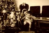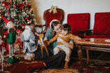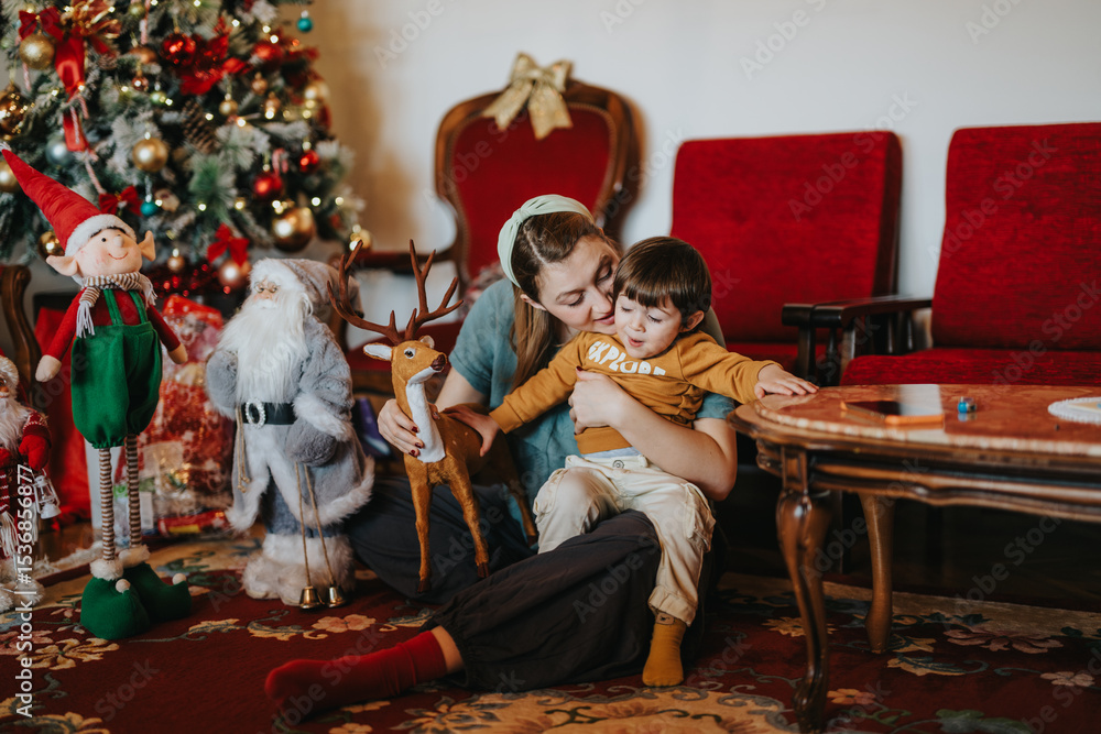 Warm scene of a mother embracing her child in a cozy room adorned with Christmas decorations, toys, and a festively lit tree, epitomizing love and holiday spirit.