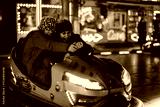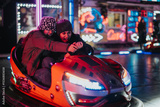Two people sharing laughs and thrills in a colorful bumper car ride under bright neon lighting, emphasizing excitement and togetherness in an amusement park setting.