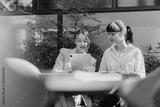 Two professional women working together with a tablet in a green setting. Represents collaboration, teamwork, and productivity in a modern professional environment.