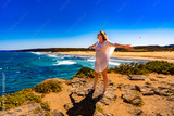 Beautiful middle aged woman standing in flowing dress at viewpoint on sandy beach Bordeira Praia in Portugal in summertime. Side view