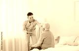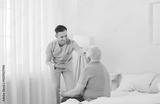 Healthcare professional is attentively engaging with elderly man seated on bed in healthcare room. Young male doctor is cheerfully chatting with elderly man sitting on bed discussing patients needs.