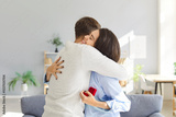 Loving couple embraces tightly as they celebrate their recent engagement proposal. Woman holds small red box for her engagement ring in hand, and her facial expression radiates happiness and love.